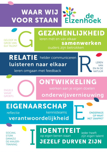 Op de Elzenhoek gaan we voor GROEI: Gezamenlijkheid, Relatie, Ontwikkeling, Eigenaarschap en Identiteit. We willen onze leerlingen laten groeien op cognitief gebied en op het sociaal-emotionele vlak. Dat lukt alleen als je oog hebt voor elkaar. Op de Elzenhoek worden leerlingen echt gezien.